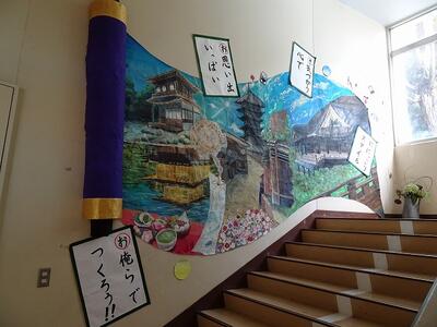 3年生の教室に向かう階段です。美術部の3年生制作の作品が飾られています。清水寺、東寺、金閣寺を巻物風に描いた大作です。「おおきに」の学年スローガンのかるた札も作られています。クラスでの委員会や係活動に加え、部活動でもこうした活動を地道に行っていることをうれしく思います。学年全体の生徒の気持ちもますます盛り上がってきました。