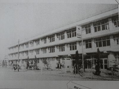 開校当時の学校の様子です。校舎の前は校庭に見えますが、街路樹や歩道等整備される前の道路です。