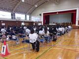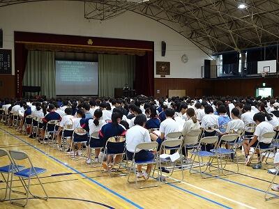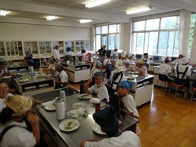 今日の学校の様子から 投稿: 美原中承認者 (14:53) 1年生の家庭科の授業です。調理実習をしていました。豚肉の生姜焼きを作りました。また、キュウリの切り方テストということで、様々な形のキュウリも添えられていました。午後の授業でしたが、自分たちで調理したからでしょう、おいしそうに皆で食べていました。 3年生は、午後、進路学習会を実施しました。保護者と並んで座り、入試までのスケジュールを中心に説明を聞きながら確認をしました。