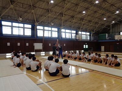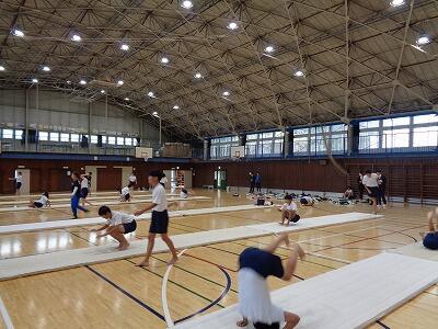 授業の様子から 投稿: 美原中承認者 (12:25) 2年生の保健体育の授業です。器械運動の学習です。近隣の中学校の体育担当者を招いての公開授業を行いました。この時間は、倒立前転と倒立ブリッジを仲間と協力して練習していました。