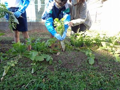 7組では、本日、校地内の畑で大根の収穫を行いました。種をまいて育てて収穫といった体験は、野菜は買うものという経験しかない子どもにとってはとくに貴重なものです。ひときわおいしく食べられることでしょう。
