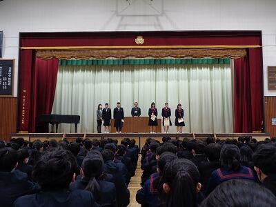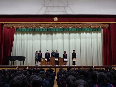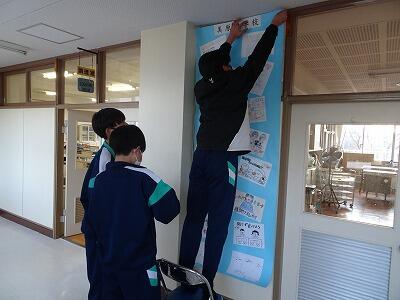 学校の様子から 投稿: 美原中承認者 (16:58) 今朝は、表彰朝会でした。コンクールや大会等の表彰を行いました。 また、放課後は、専門委員会でした。3年生にとっては、最後の委員会です。給食委員会では、先だって学校給食展に出品したポスターを廊下に展示していました。