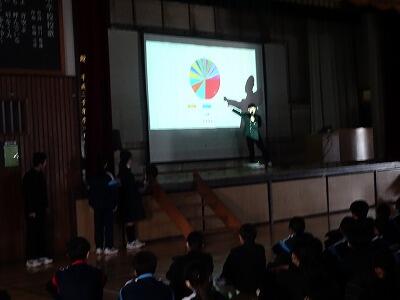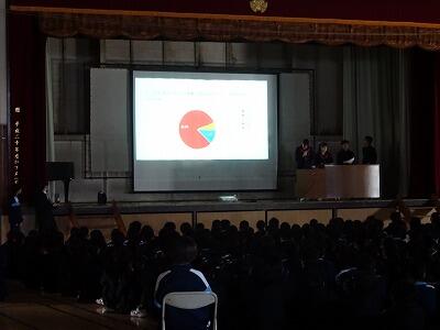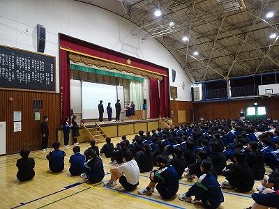 また、昨日の朝、生徒朝会が行われました。ボランティア委員会からのペットボトルのキャップのキャンペーン、保健委員会からは、「おなかの健康」をテーマにした学校保健委員会の報告とハンカチキャンペーンの表彰、情報委員会からは、昼の放送のリクエスト曲の抽選など、関係生徒が、よく工夫した発表をしました。加えて、朝会終了後、学校からあらためて、いじめの防止やSNSの適切な利用(いわゆるデジタルタトゥーと呼ばれるような事案を起こすことないよう投稿の可否を判断する等)について話をしました。