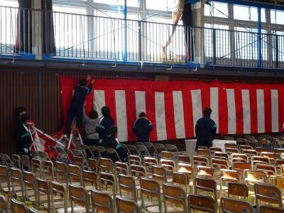 学校の様子から 投稿: 美原中承認者 (20:00) 今日、3年生は最後の給食です。卒業お祝い献立ということで、赤飯や唐揚げ、お祝いすまし汁、味噌和え、お祝いケーキが出ました。 午後は、1,2年生で、卒業式の会場づくりをしました。一生懸命に準備を進めてくれました。