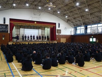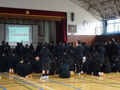 学校の様子から 投稿: 美原中承認者 (15:09) 本日、生徒会企画で生徒朝会が行われました。3年生が卒業し、1,2年生での開催となりました。後期専門委員会の委員長から、活動の成果と課題の報告があったあと、本部企画のクイズ大会で盛り上がりました。
