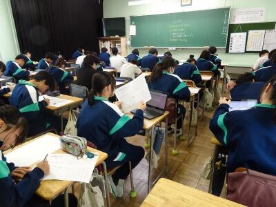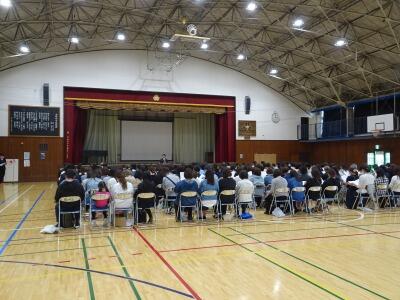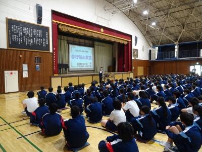 1年生は、グループごとにプリントの答えを探しながら、学校探検を行いました。また、年度当初の時間を使って、人権についての学習、人権作文の取り組みを行っています。4校時は、埼玉県警、非行防止指導班の方に来校いただき、非行防止教室を行いました。県内では闇バイトで中学生が逮捕されている事例もあり、自分の身を自分で守ること、知識として知っているだけではだめで、行動できて意味があるとの言葉が印象的でした。