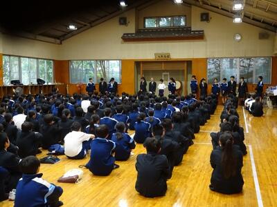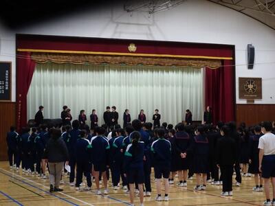 3年生は、各クラスからの学級目標の発表のあと、学級委員会より活動方針について発表がありました。昨年までの学年主任の先生のメッセージをいかして、歌も交え、学年として最高の1年にしていこうというものでした。3年生の活躍が他校に転勤された先生方にも届くよう頑張ってほしいです。